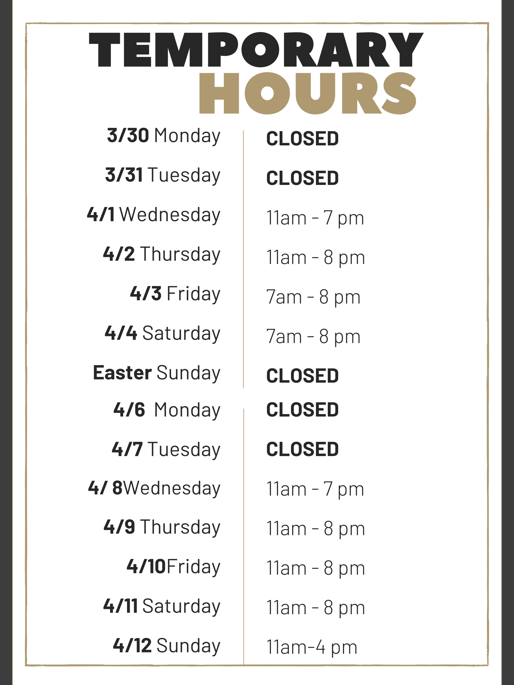Taking a Quick "Mulligan" on our Mondays & Tuesdays! ⛳ As we gear up for the greens to open, we’re shifting our hours for a few weeks. We will be closed every Monday and Tuesday until the golf course officially opens for the season. Don't worry—we’ll be back to full swing soon! In the meantime, come see us Wednesday through Sunday for all your favorites. Stay tuned for our "Opening Day" announcement!